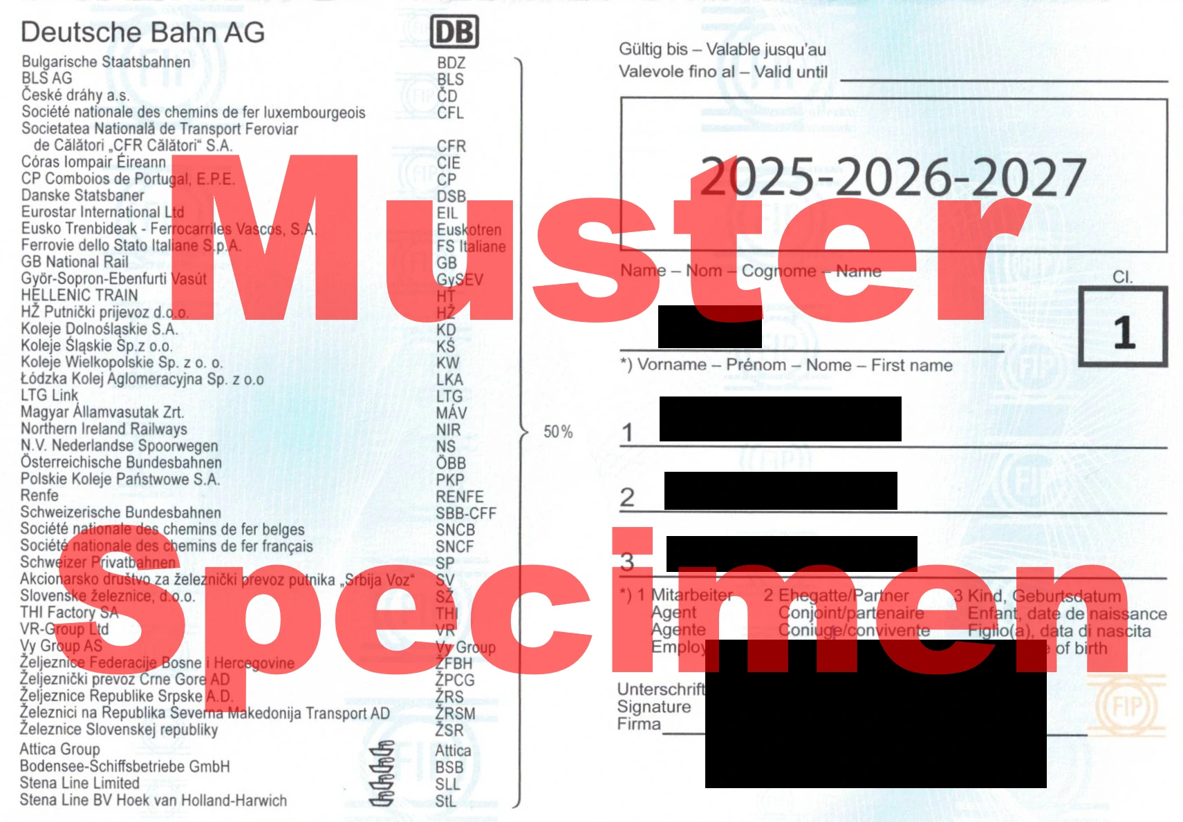 FIP Coupons (colloquially known as international free travel passes) entitle you to travel on trains operated by the company indicated on the coupon. An FIP Coupon consists of several fields. Each field is valid for two consecutive days. You must enter the first day of validity on the ticket; the ticket is then valid on that day and the following day. The different fields do not have to be used on consecutive days, but the dates must fall within the printed validity period.